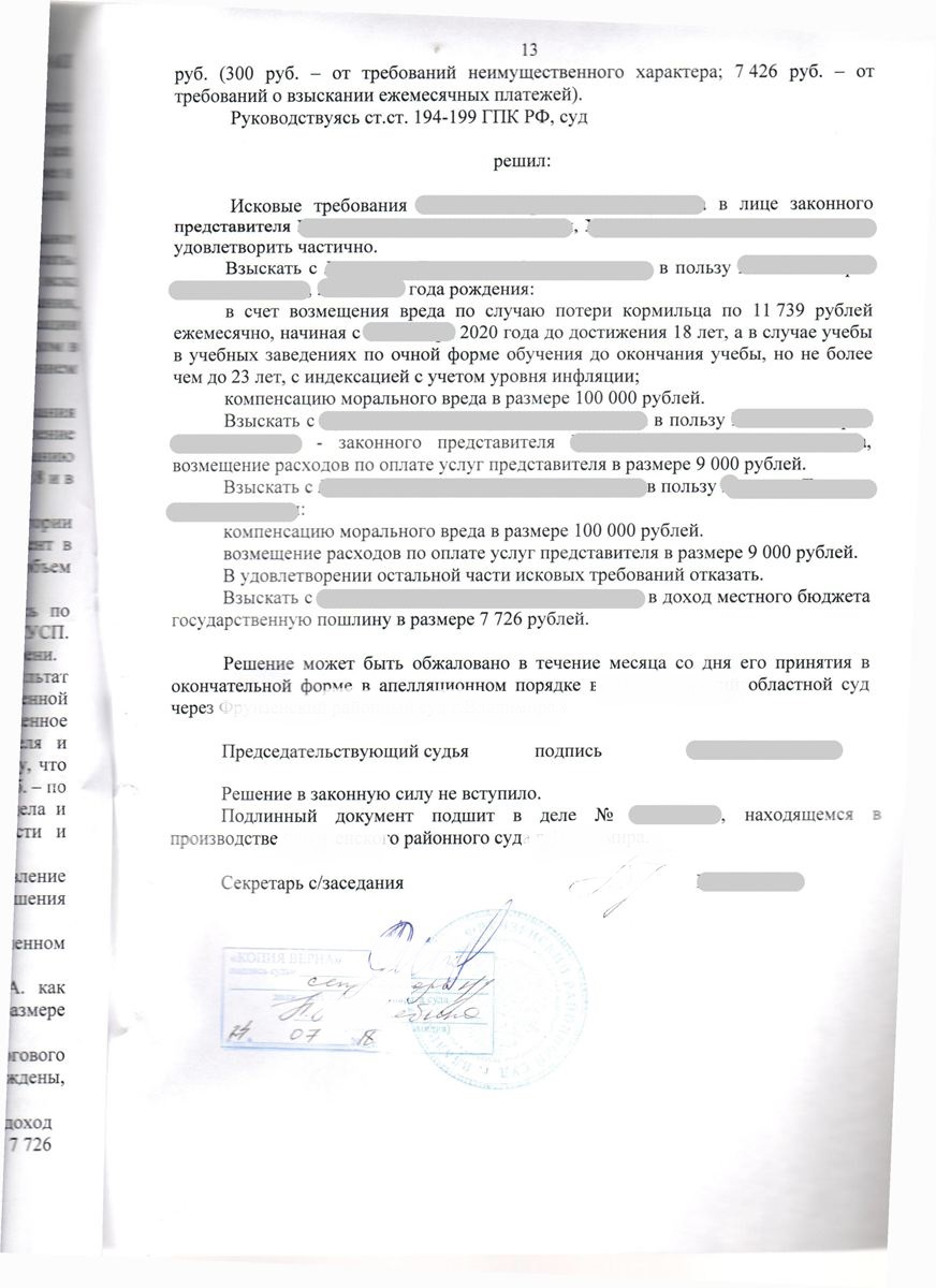 с ответчика составляла 2 000 000 (два  миллиона) рублей, а также ежемесячные денежные платежи в связи с утратой кормильца, были определенны в размере 24517,78 (двадцать четыре тысячи пятьсот семнадцать  рублей, 78 копеек ) до достижения ребенком оставшимся без кормильца возраста 23 лет.