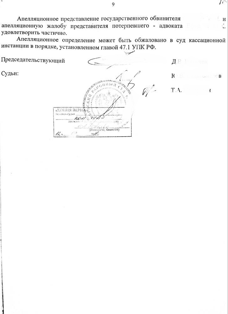 Изучив приговор и материалы уголовного дела, действуя в процессуальном статусе представителя потерпевшего, мною были выявлены существенные нарушения норм уголовного и уголовно-процессуального закона. Согласовав позицию с потерпевшим, в установленные законом сроки была подана апелляционная жалоба.